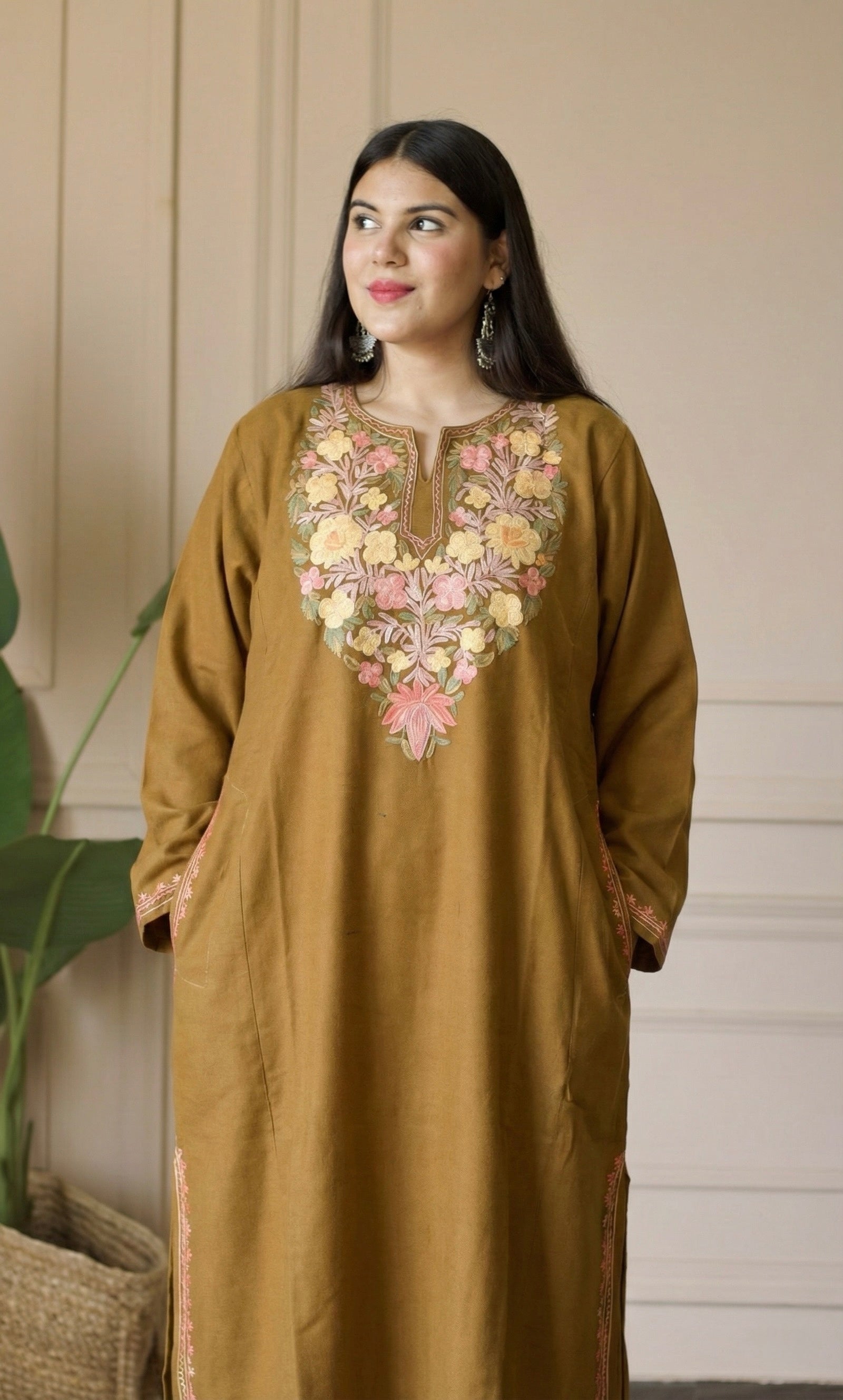 Cocoa Saffron Bloom Aari Embroidered Fine Cashmilon Pheran