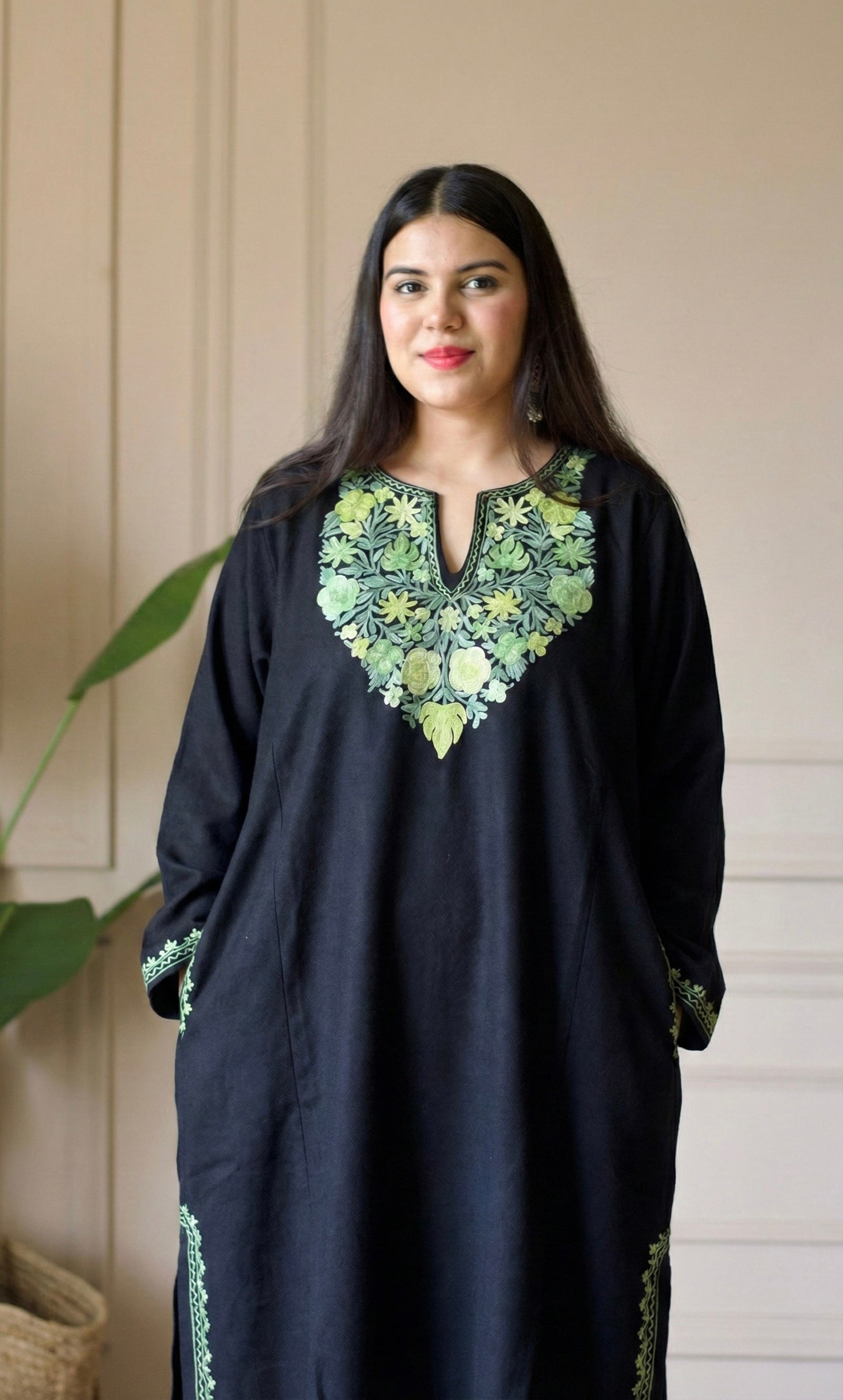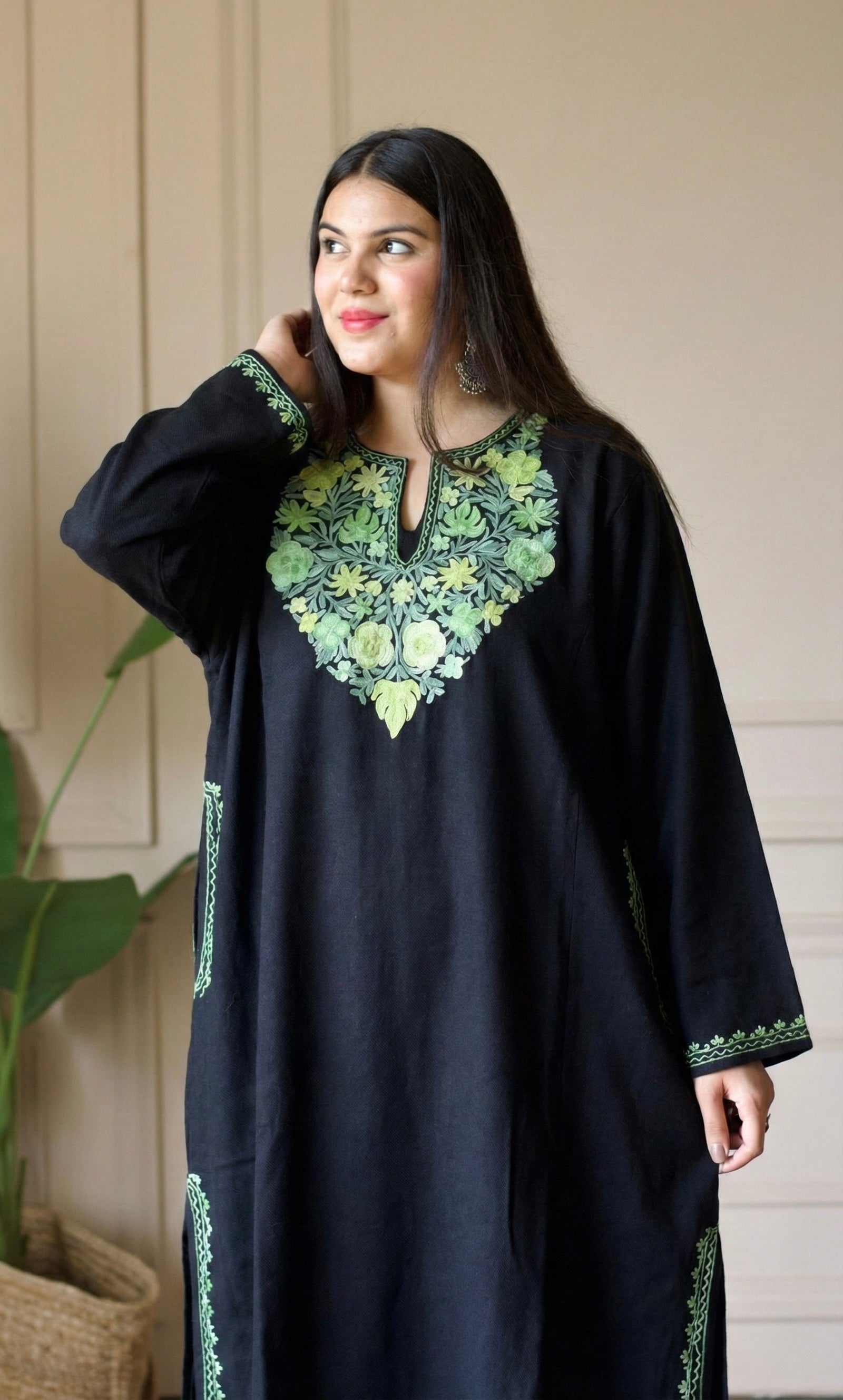 Black Emerald Bloom Aari Embroidered Fine Cashmilon Pheran