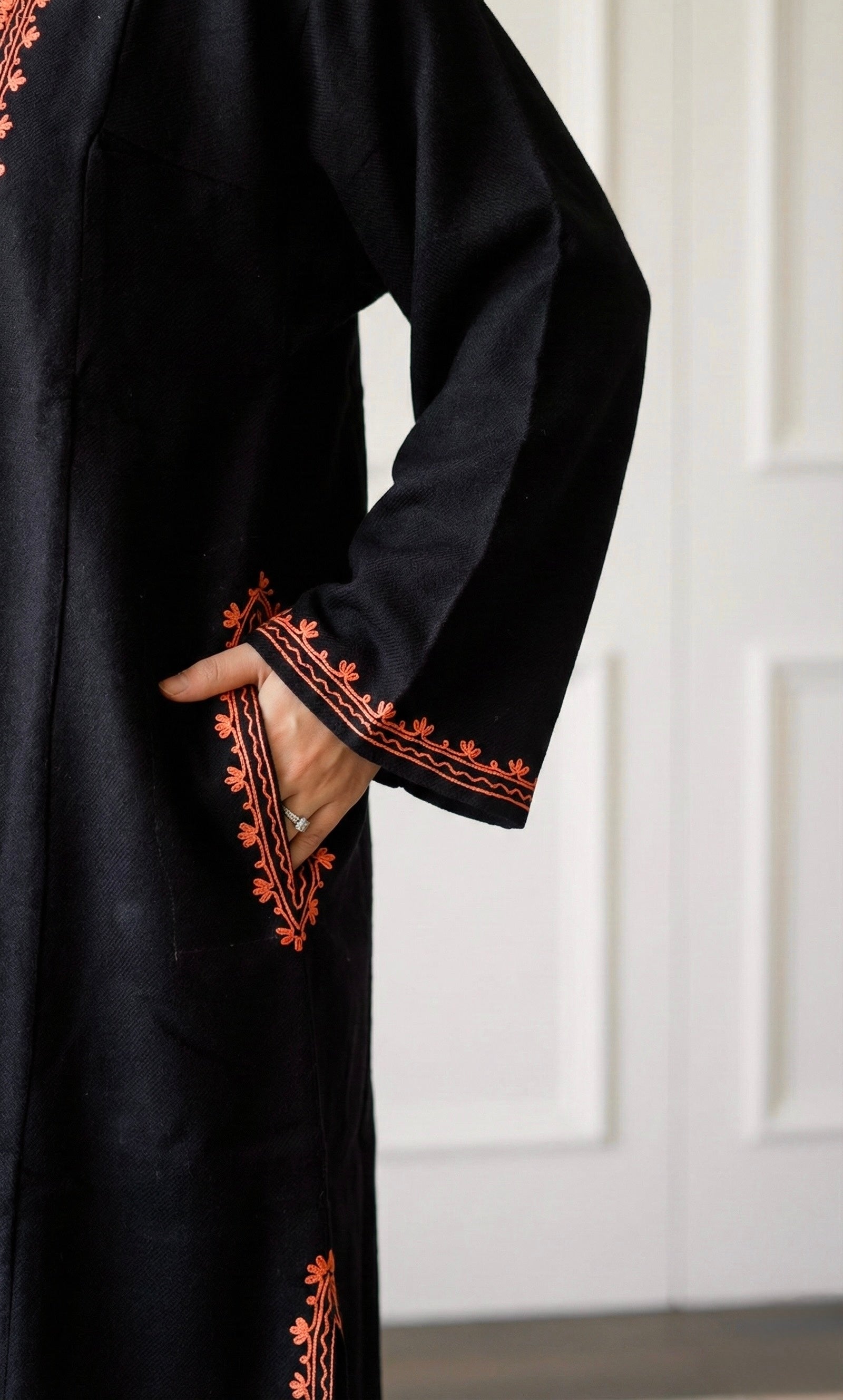 Black Saffron Bloom Aari Embroidered Fine Cashmilon Pheran