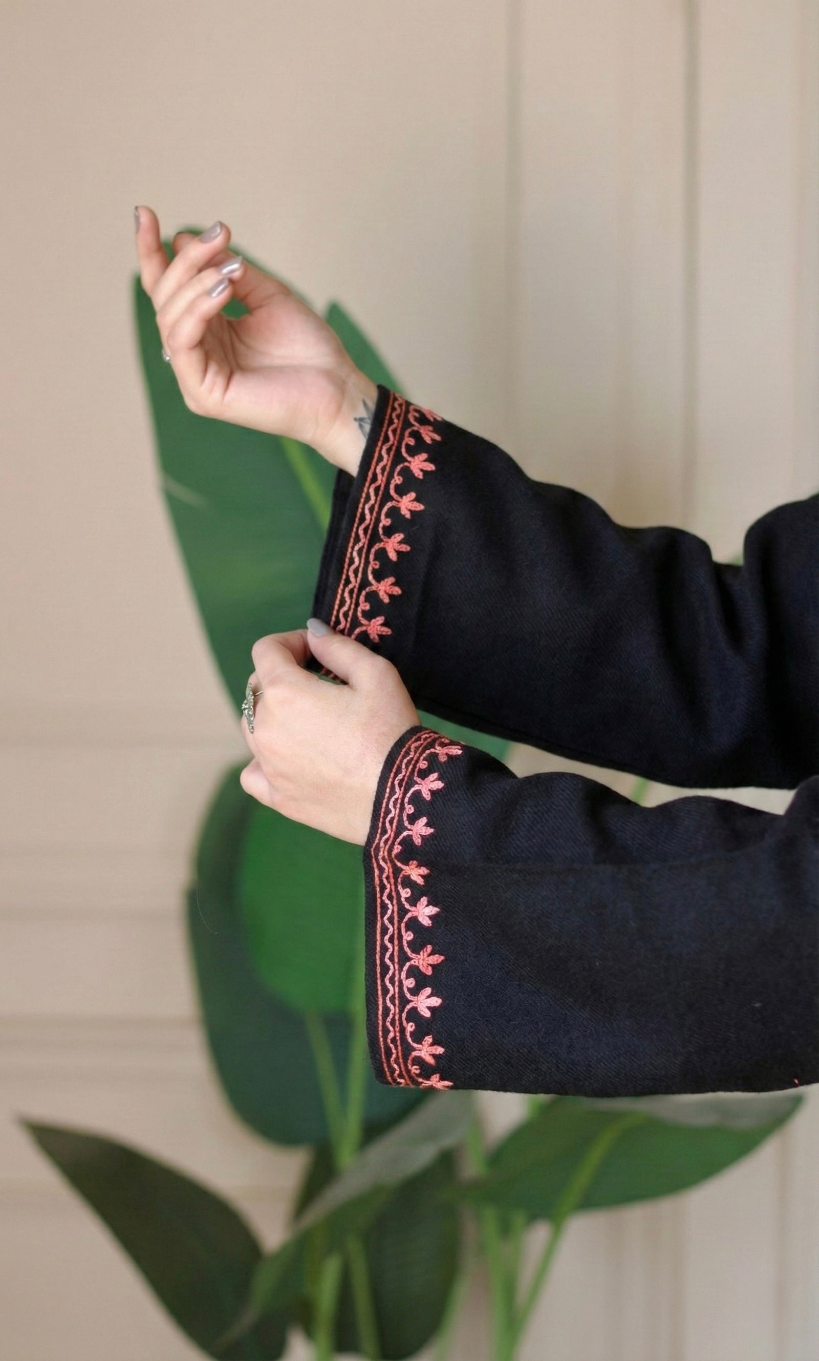 Sunset Bloom Black Aari Embroidered Fine Cashmilon Pheran