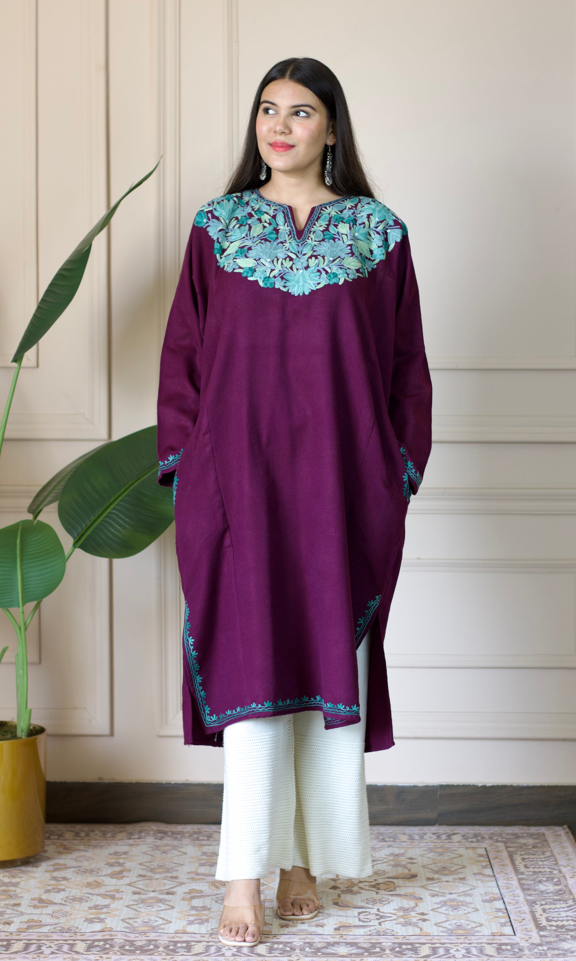 Plum Glow Aari Embroidered Fine Cashmilon Pheran