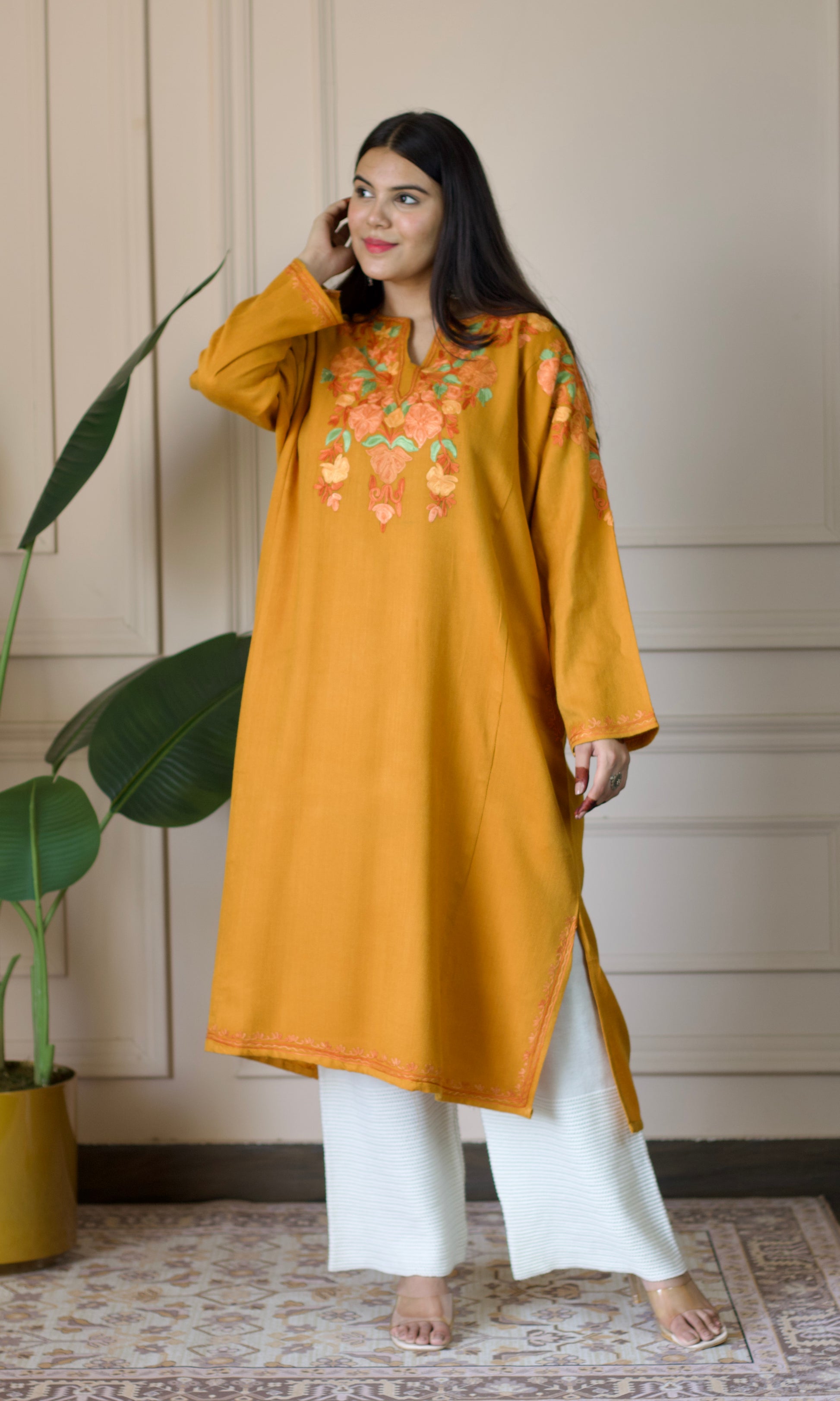 Saffron Bloom Aari Embroidered Mustard Fine Cashmilon Pheran