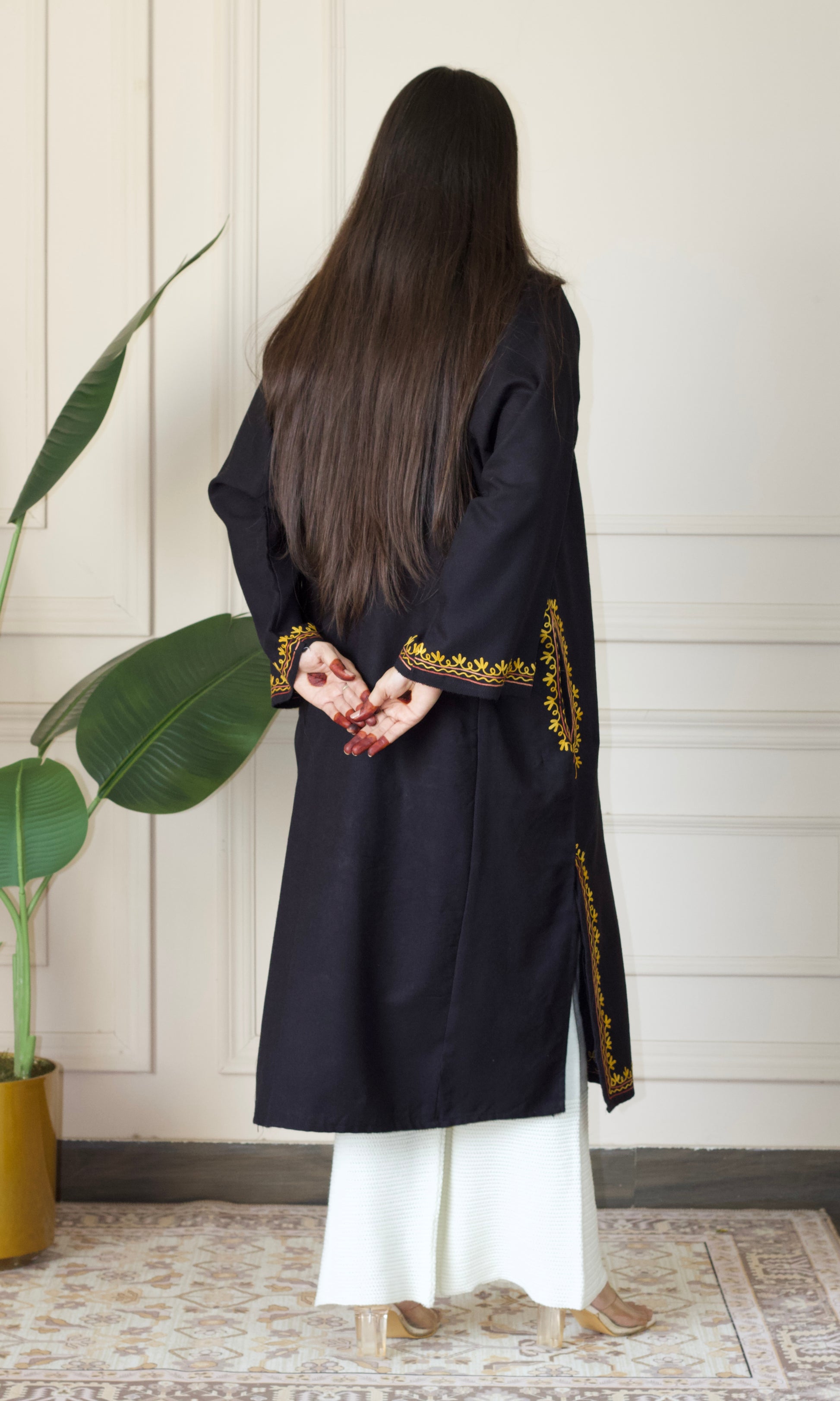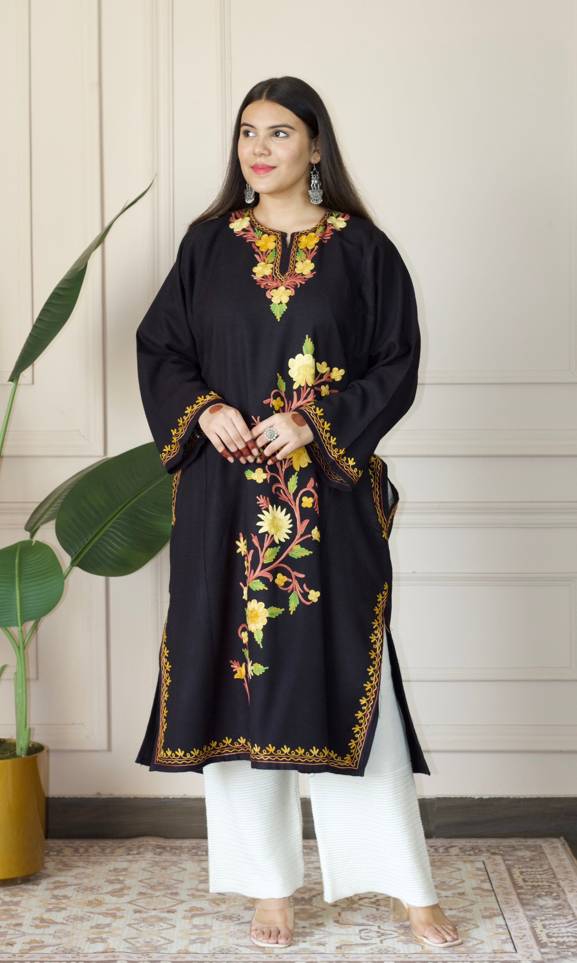 Saffron Glow Aari Embroidered Black Fine Cashmilon Pheran