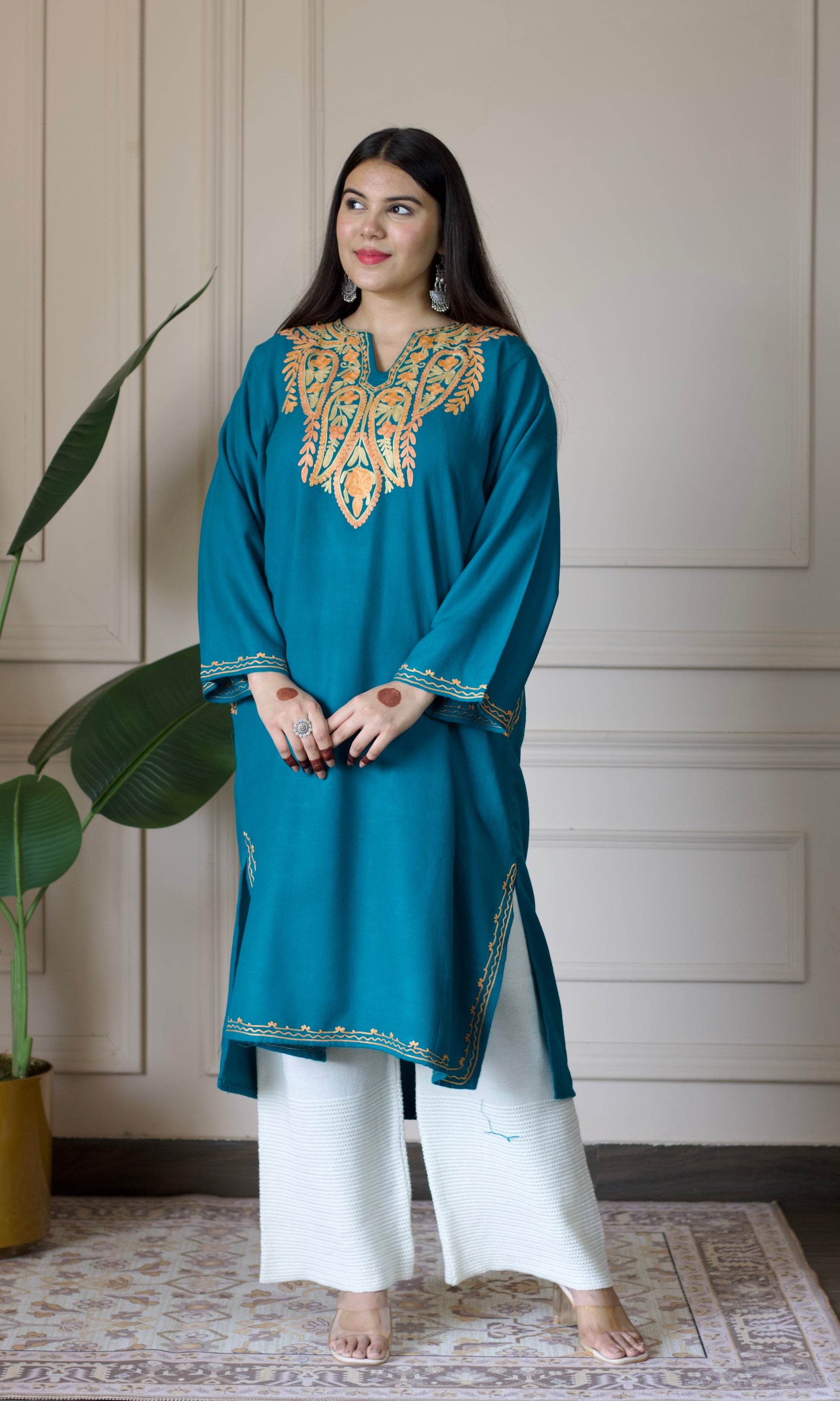 Sea Green Aari Embroidered Fine Cashmilon Pheran